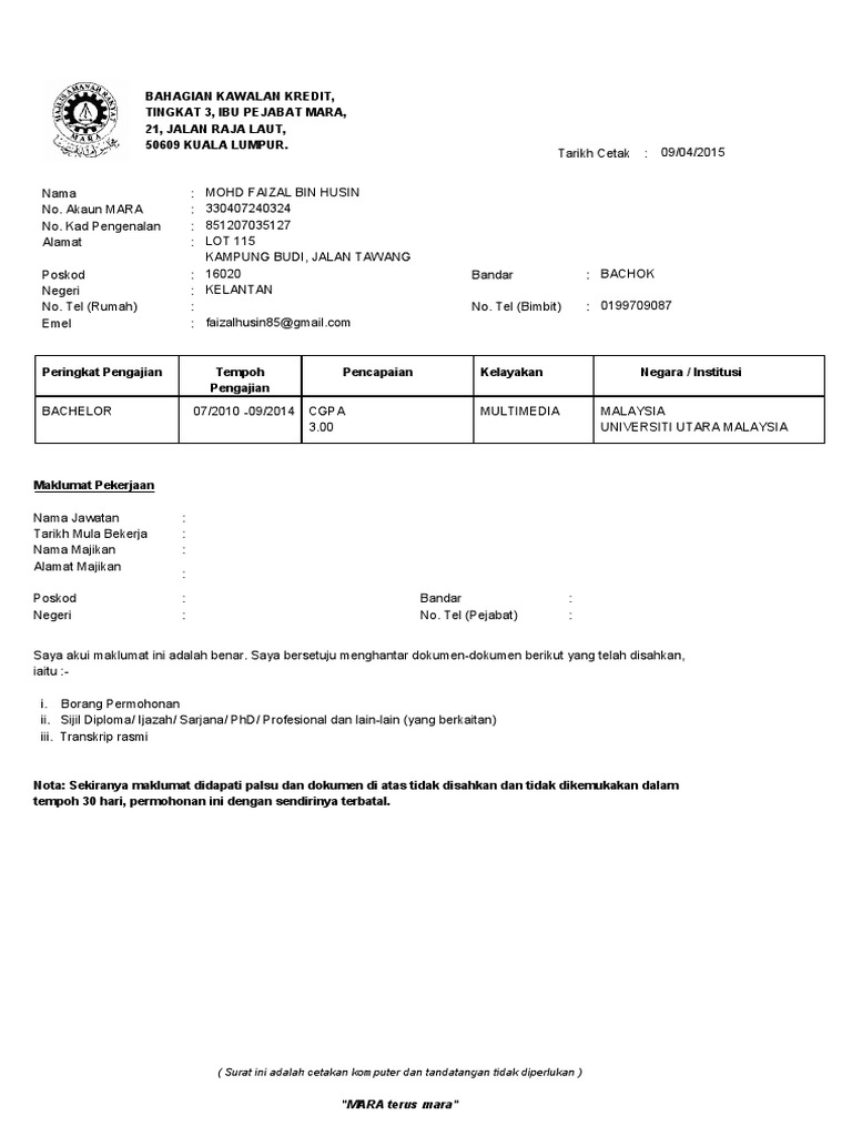 Tersedia di 1000+ merchant online & offline. Aku hulurkan surat dari mara dan juga borang. Your address 19/3/2017 bahagian kawalan kredit tingkat 3, ibu pejabat mara 21, jalan mara 50609 kuala lumpur tel : Saya ingin memohon surat pengesahan selesai baki pinjaman. Bahagian kawalan kredit, bangunan mara kuala lumpur •.